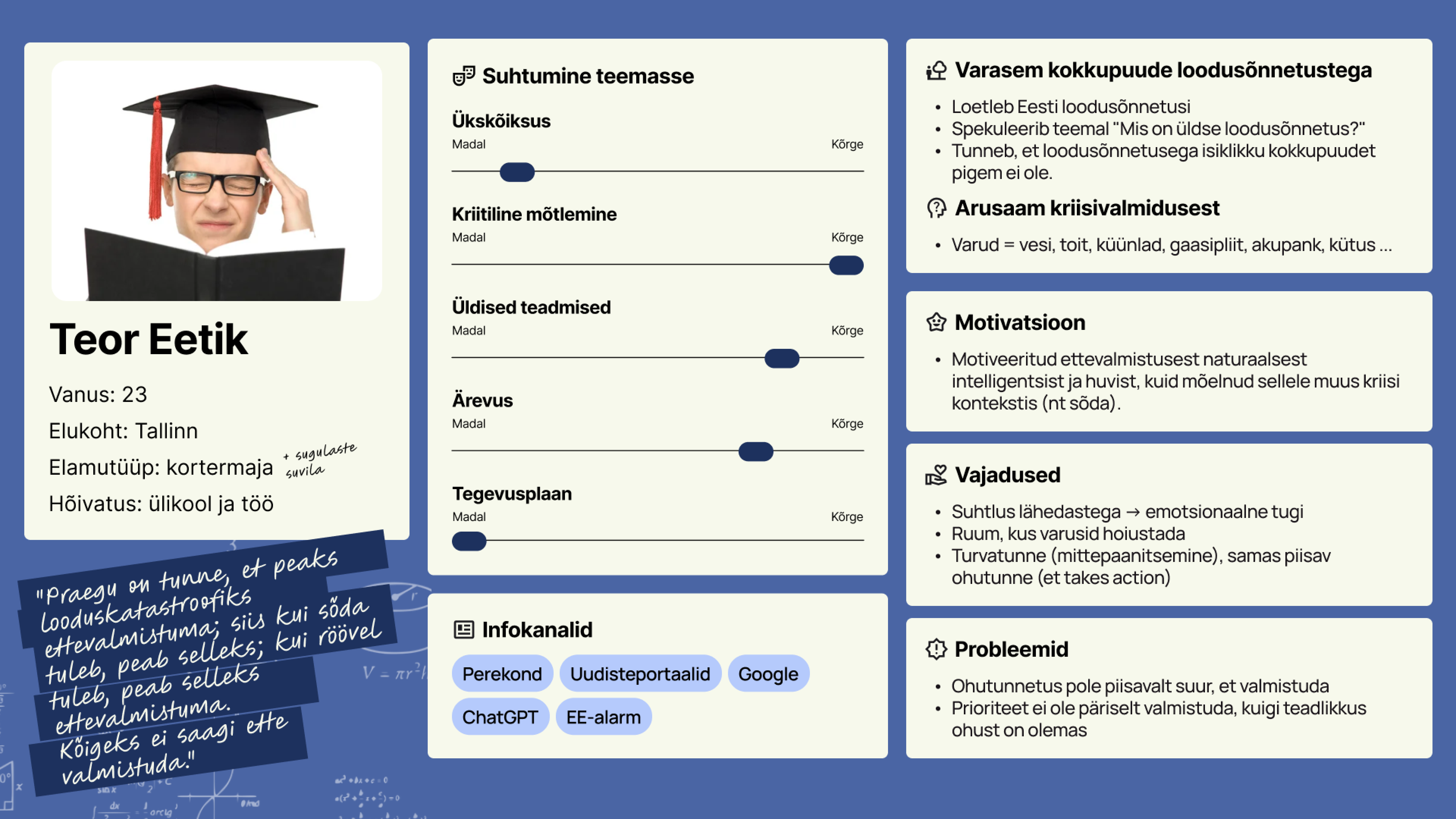 Both of the personas, Clueless Chloe and Theoretical Theodor, have low alertness and preparedness for natural crises.